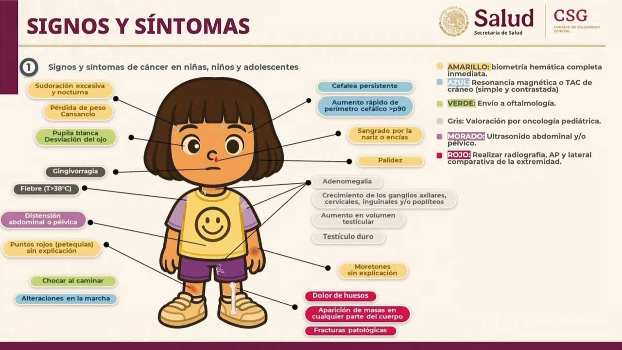 El protocolo también enfatiza que el tipo de cáncer más común en la infancia es la leucemia, seguida por tumores cerebrales y testiculares. El titular de Salud presentó criterios clínicos para referir de forma inmediata al menor a un segundo o tercer nivel de atención médica. Estos incluyen: